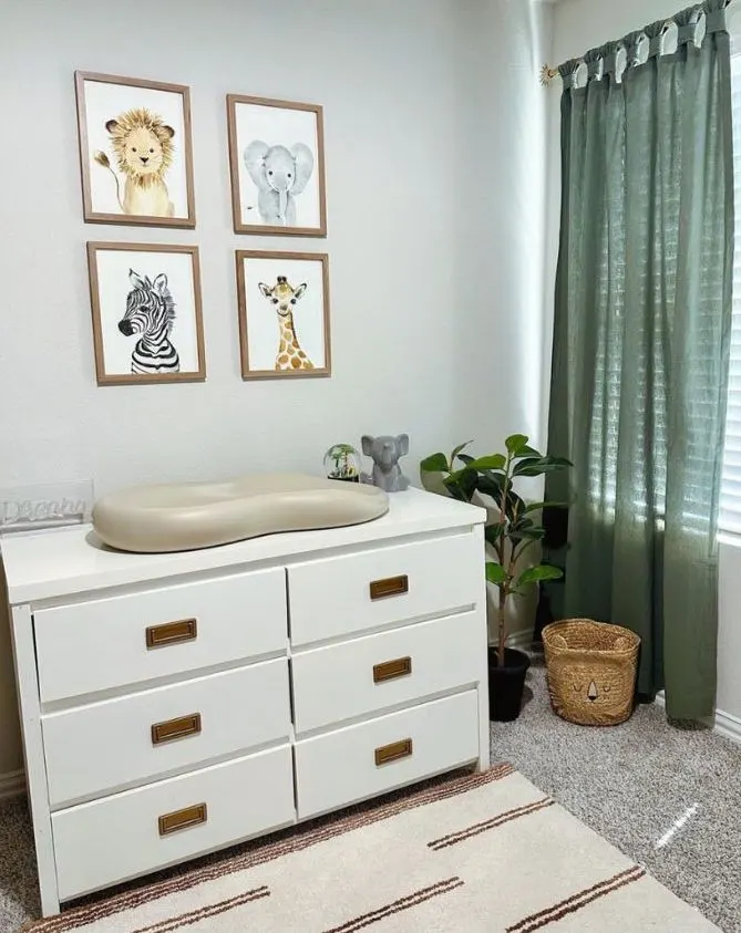 A jungle theme works perfectly as the colours in the prints you can use on the walls will generally be neutral – yellows, oranges, greens and greys.