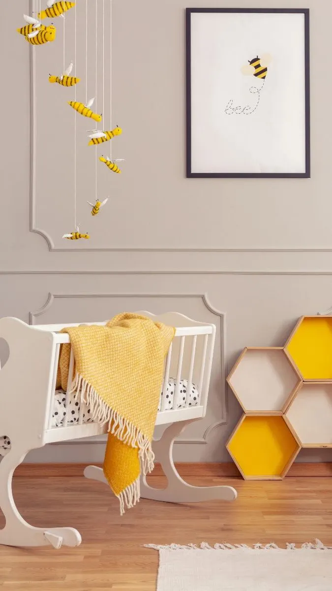 Use black, white and of course yellow to bring this theme together. Shapes really help to make it work as well, so be sure to add some honeycomb shelving or wall decor into your nursery too.
