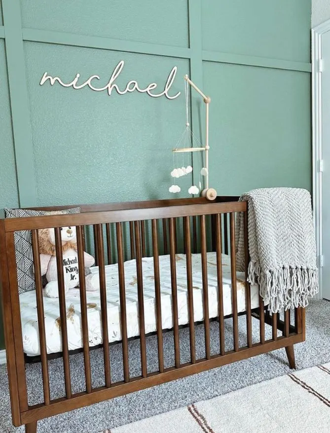 Modern nurseries may incorporate an earthy boho vibe with lots of beige, grey and creams, or go more bold with dark panelled walls, big wooden letters spelling out baby’s name and a modern crib.