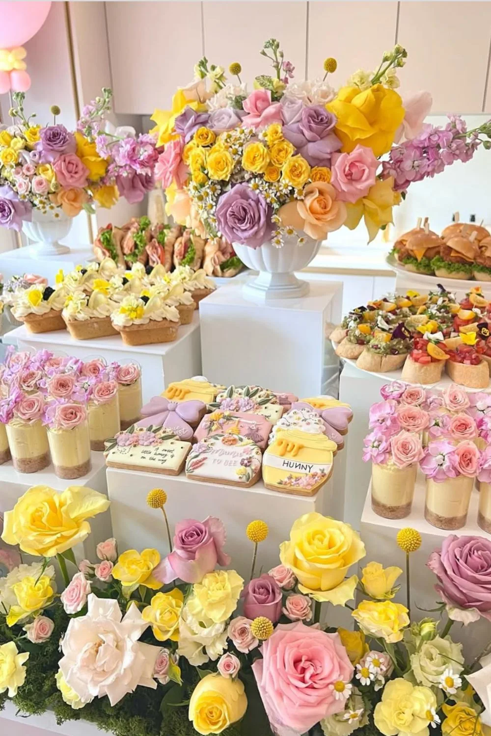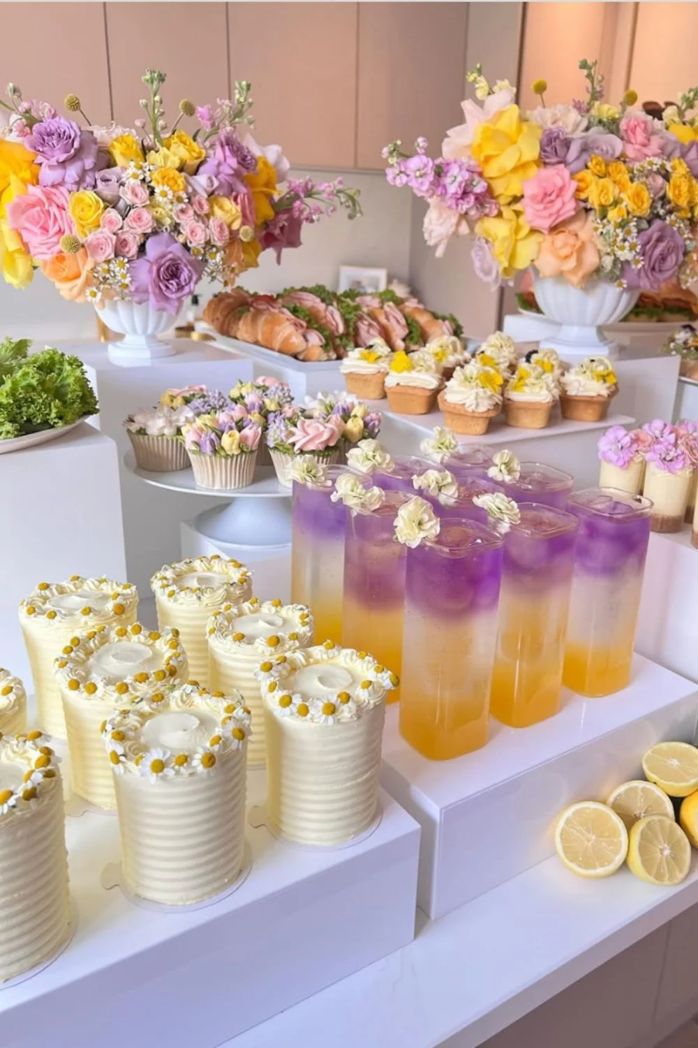 I love how this baby shower took the colours yellow, pink and purple and used them to tie together the floral decor with the food. Just look at those pretty drinks!