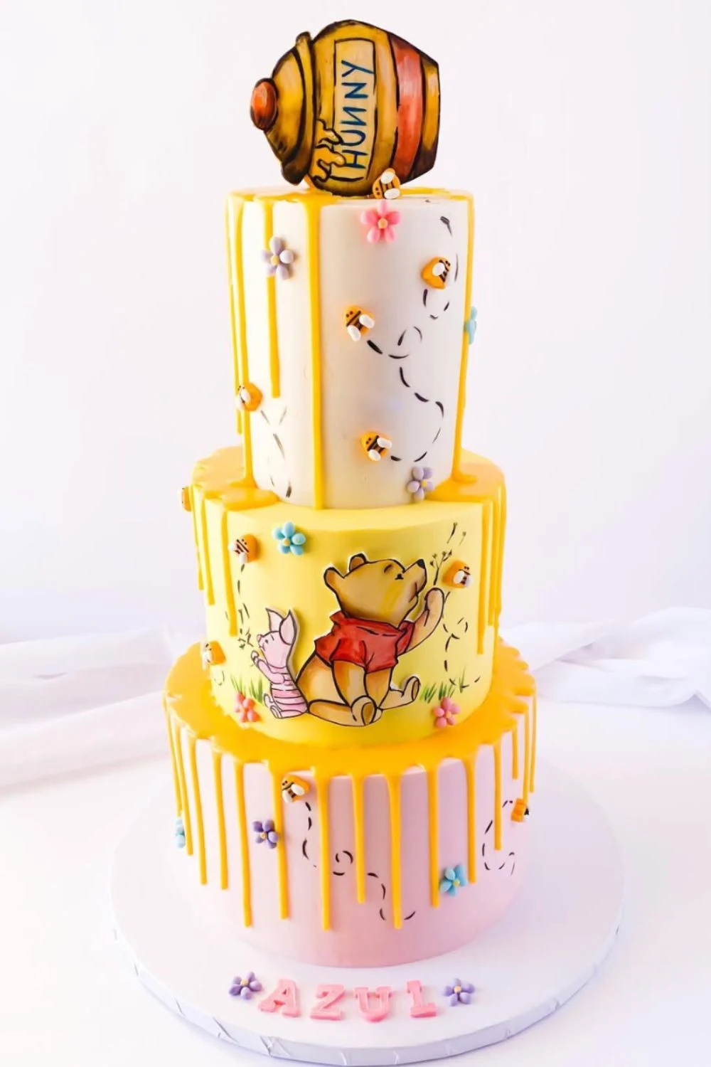 A gorgeous cake featuring Winnie the Pooh characters and honey will delight your guests and is a perfect centrepiece for your food table.