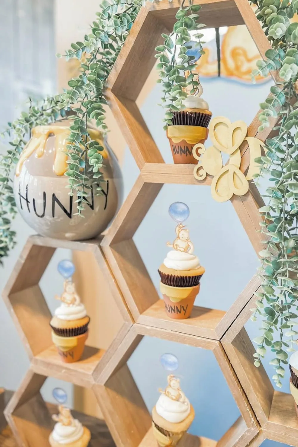 I love these honeycomb shelves, which have been use to display beautiful Winnie the Pooh cupcakes. The greenery and big “hunny” pot are such lovely touches too!